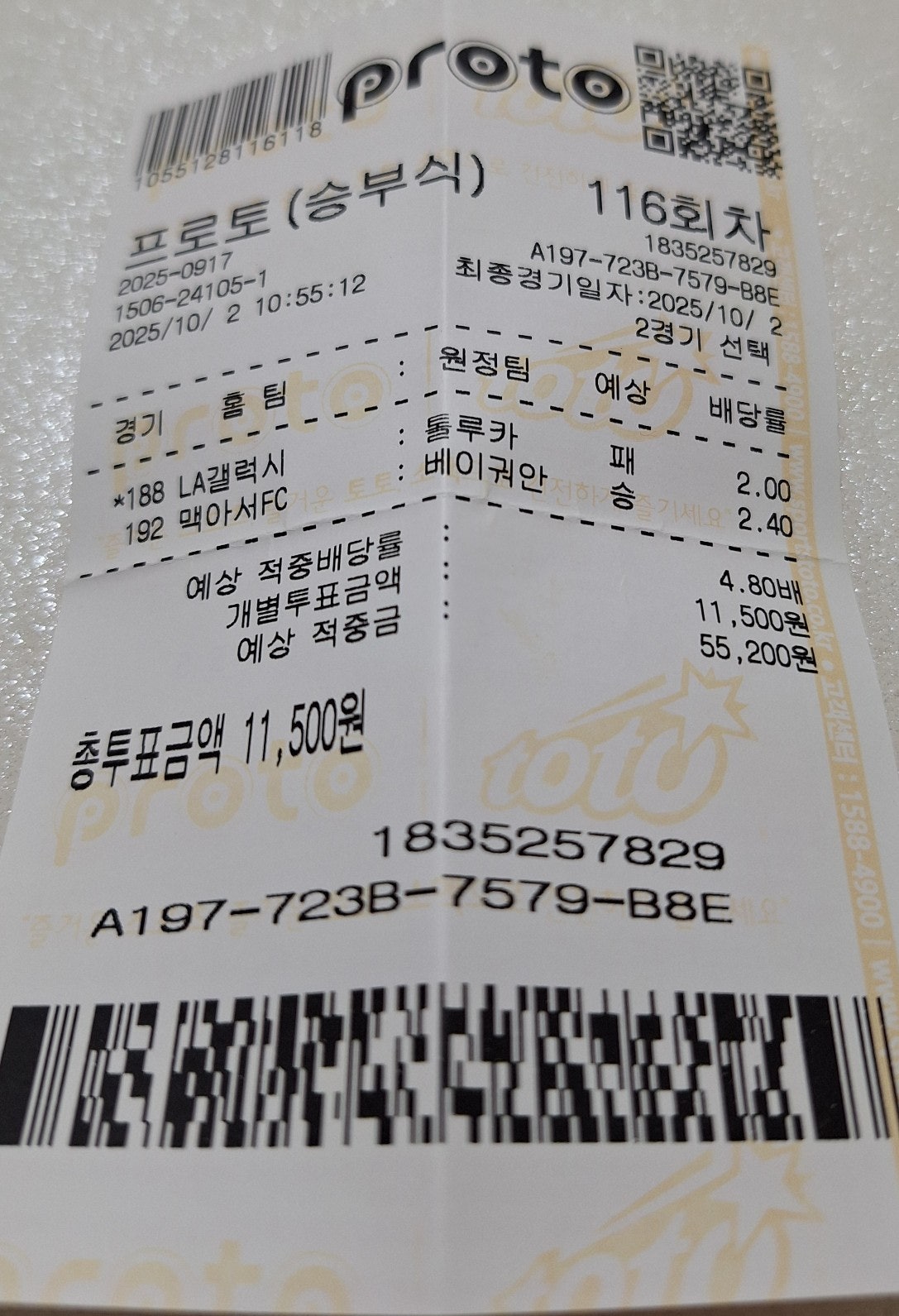 오늘 새벽경기 찍어놓은거 환급하고 사진찍은줄