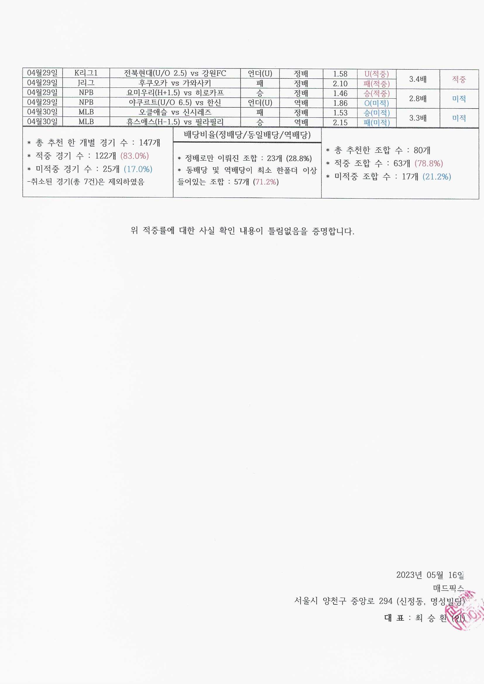(VVIP) 2023년 04월 고배당 적중 공문 인증서